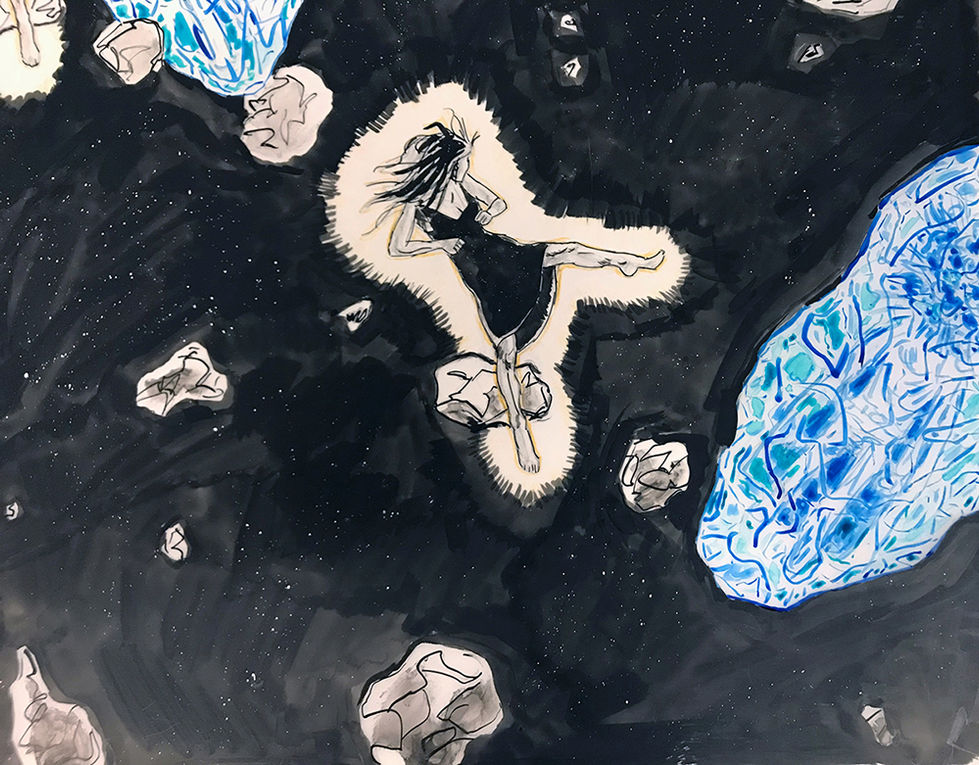 Ink, graphite, and colored pencil on Dura-lar. ExplosionHead's head is not exploding - it is an explosion. ExplosionHead's awakening in a block of ice in the rings of Saturn attracts the attention of the slumbering spirit of Lhasa de Sela on Saturn's moon, Phoebe. She investigates entrapped ExplosionHead, deciding to give him a shove in the right direction, sensing that his presence is required on Earth.